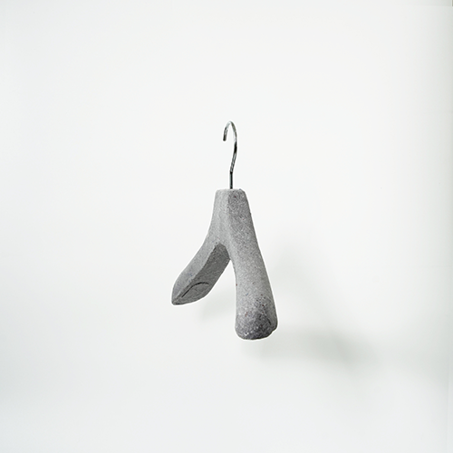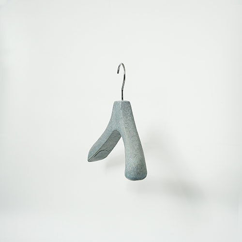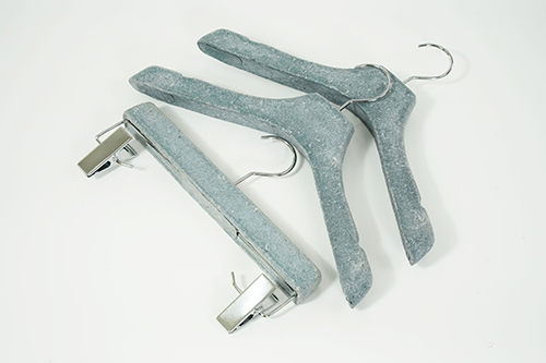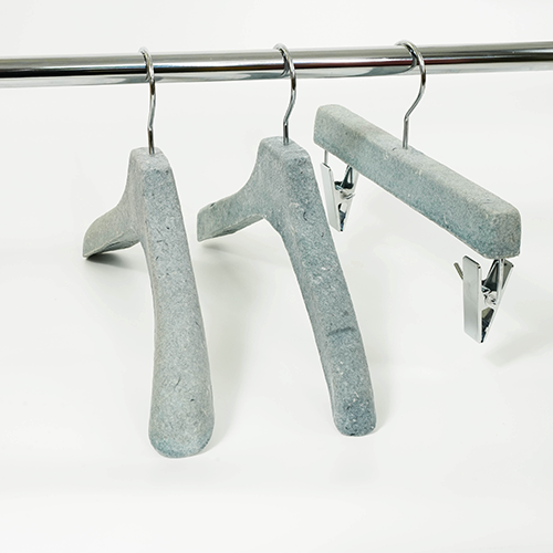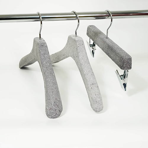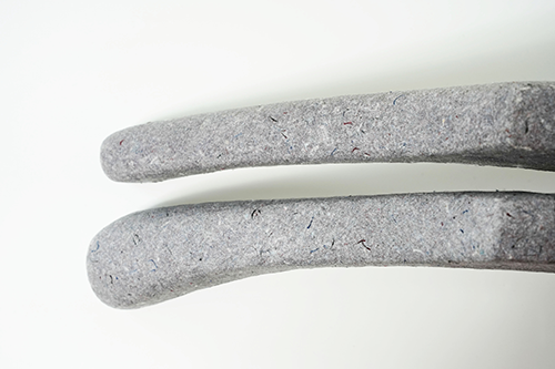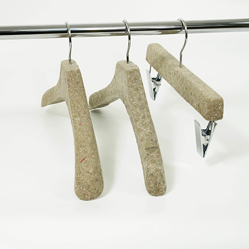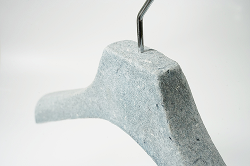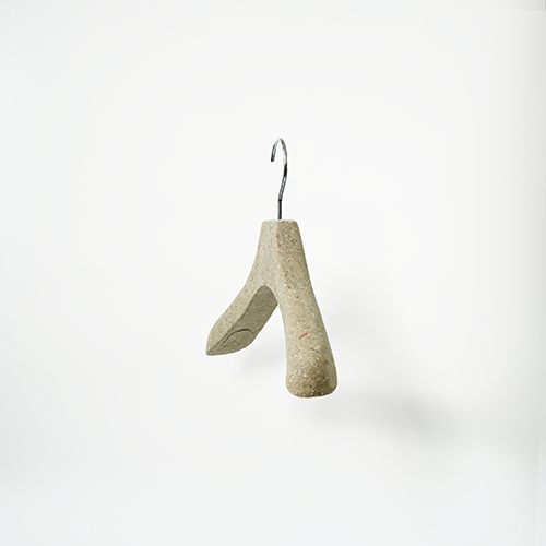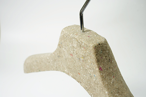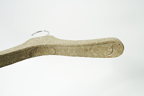 Pulp molded hanger This hanger is made from scrap of paper and scraps of fabric. It is a sustainable product because does not use FRP. The production method is the pulp molded manufacturing method. Dissolve waste paper in water to liquefy and add finely crushed pieces of cloth. A special mold is made, the mold is submerged in a pool of ingredients, and the water is removed using a vacuum machine to complete the shape. It will harden when dried naturally.There is also a coating material for increasing strength. Metal parts can be removed from the outside. Therefore, it can be divided into decomposable parts and reused parts. It is an earth-friendly material because it decomposes in the ground when discarded. We are currently developing a combination of various materials.