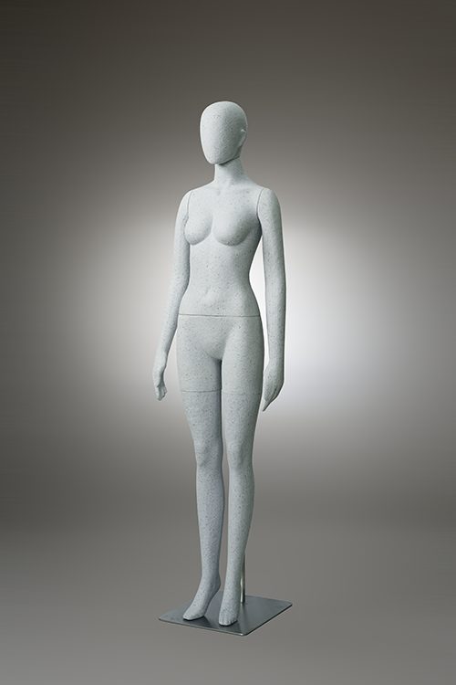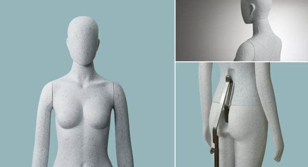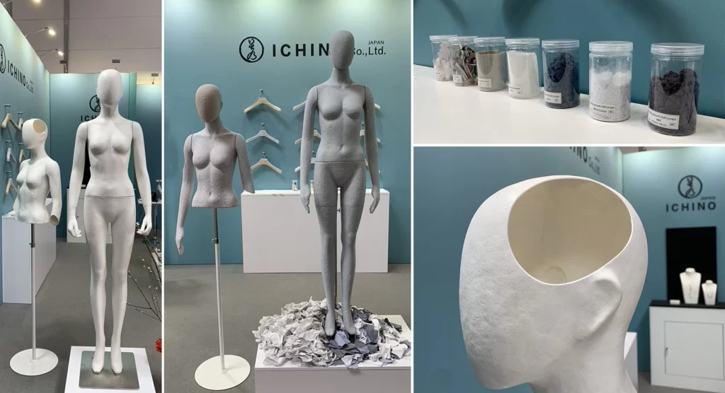 Pulp molded mannequin This mannequin is made from scrap of paper and scraps of fabric. It is a sustainable product because does not use FRP. The production method is the pulp molded manufacturing method. Dissolve waste paper in water to liquefy and add finely crushed pieces of cloth. A special mold is made, the mold is submerged in a pool of ingredients, and the water is removed using a vacuum machine to complete the shape. It will harden when dried naturally. Metal and magnet parts can be removed from the outside. Therefore, it can be divided into decomposable parts and reused parts. It is an earth-friendly material because it decomposes in the ground when discarded.